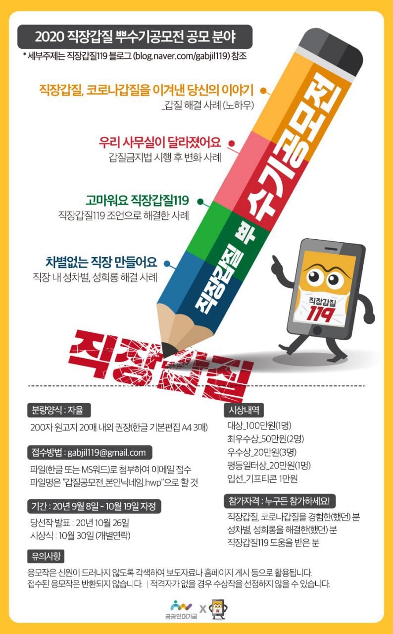 재단과 직장갑질119가 함께하고 있는 '직장생활백신 프로젝트'의 일환으로 <직장갑질 뿌수기 공모전>을 개최합니다. 자세한 내용은 아래 이미지와 공고문을 확인해주세요!