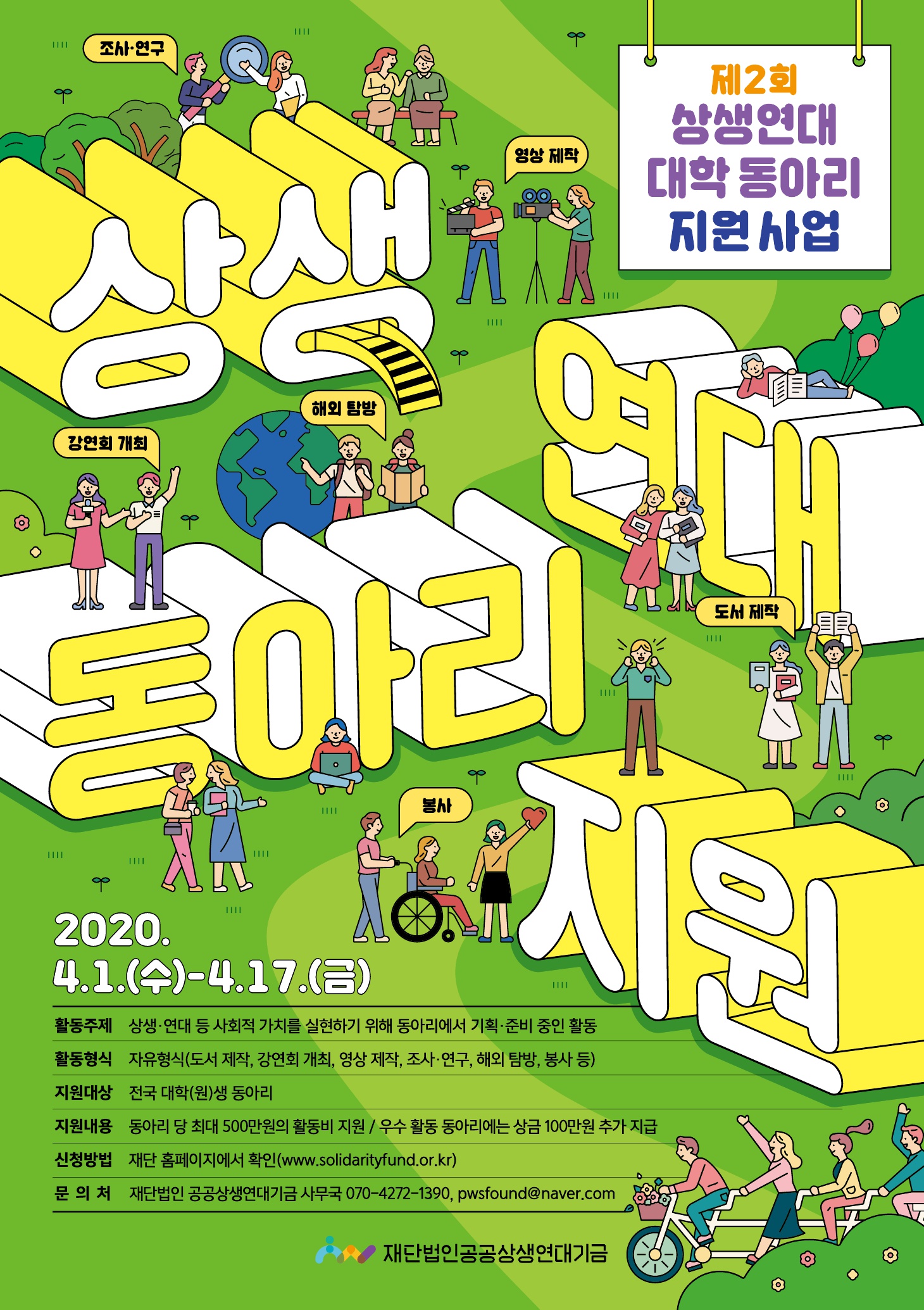 우리 재단은 청년들에게 상생, 연대 등 사회적 가치를 실천하고 스스로 성장할 수 있는 기회를 제공하기 위해 “제2회 상생연대 대학 동아리 지원 사업”을 실시합니다.