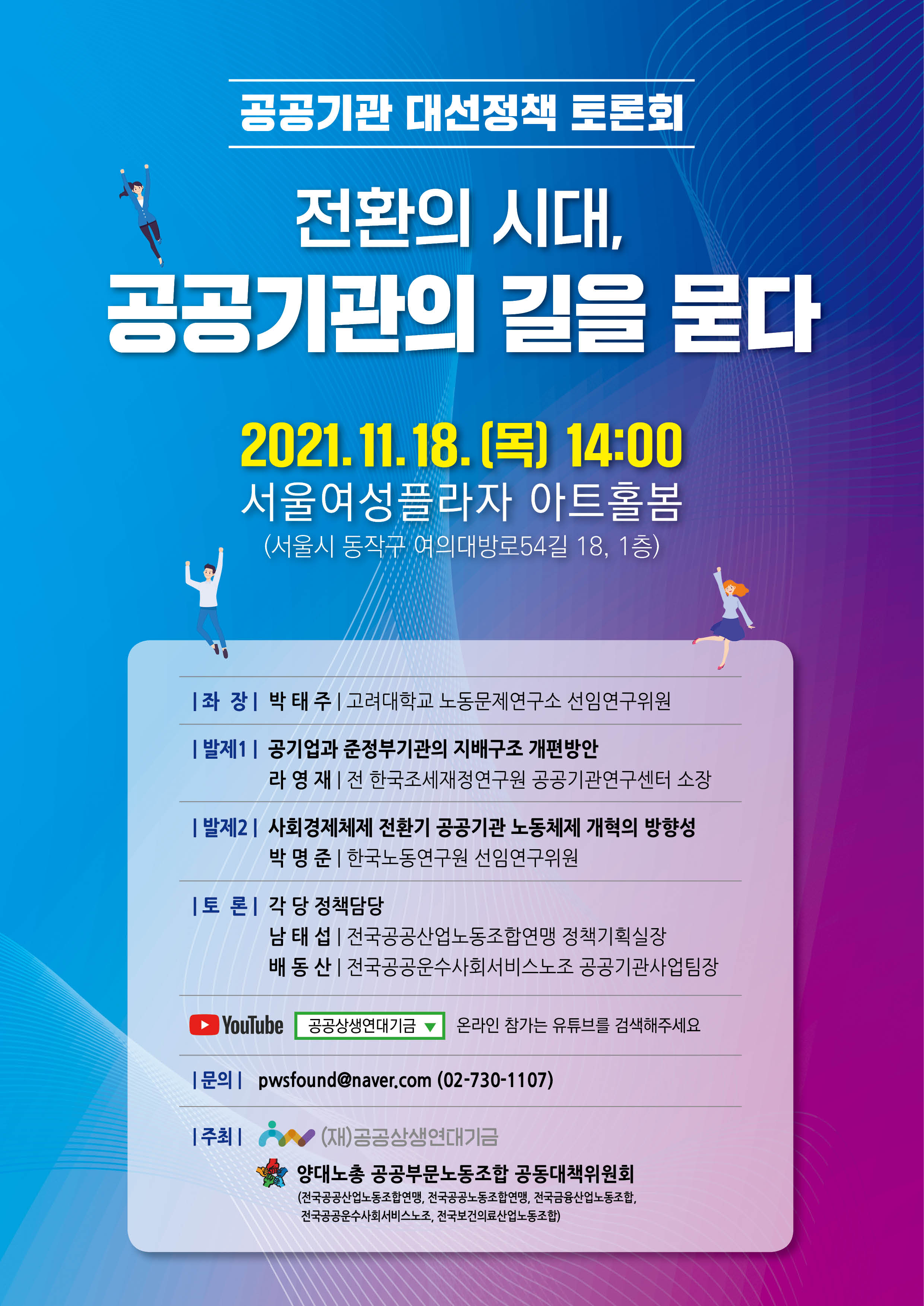 ○ 공동주최 : 재단법인 공공상생연대기금, (재)공공상생연대기금, 양대노총 공공부문노동조합 공동대책위원회(전국공공산업노동조합연맹, 전국공공노동조합연맹, 전국금융산업노동조합, 전국공공운수사회서비스노조, 전국보건의료산업노동조합)