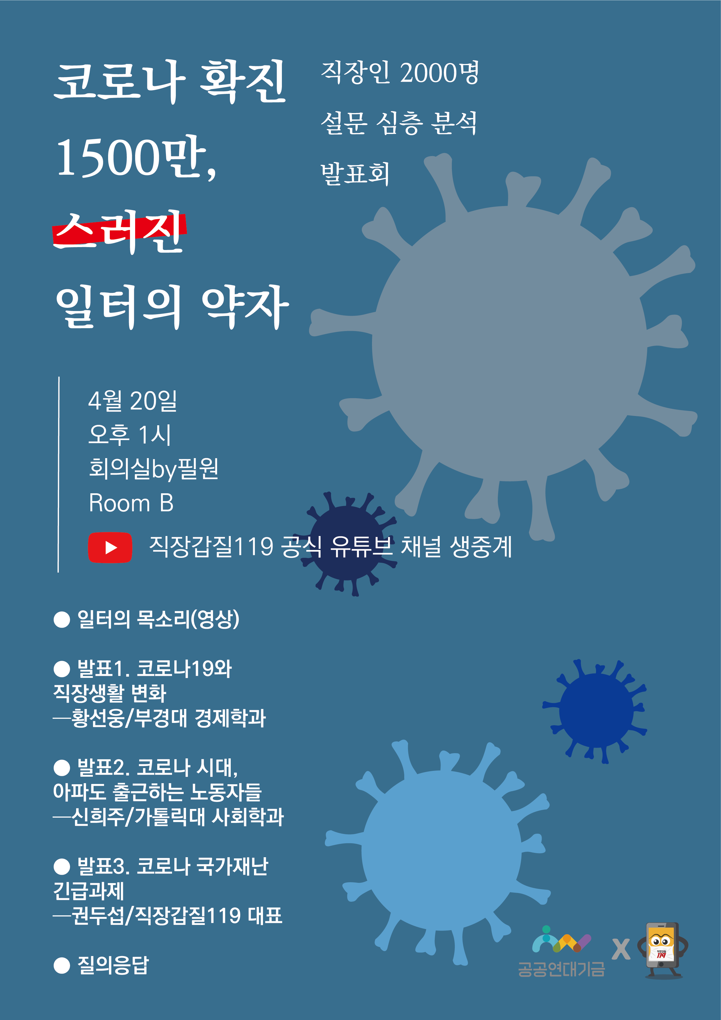 2022년 4월 11일 발표한 코로나19 직장생활변화 설문조사 결과를 바탕으로 발표회를 진행합니다. 많은 참석 및 시청 바랍니다.