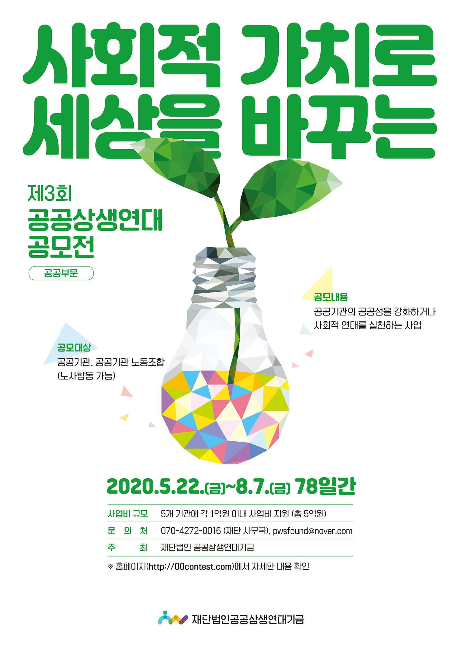 올해도 ‘제3회 공공상생연대 공모전’을 실시합니다. 열린 공모전을 통해 다채롭고 유익한 사업 아이디어를 모집해 우리 사회에 보탬이 되는 사업을 만들어 나가고자 합니다.