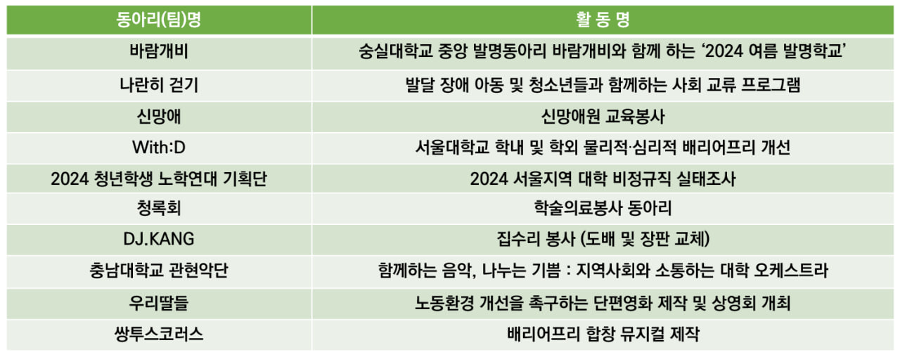 선정된 동아리 명단은 다음과 같습니다. (접수순서 순)