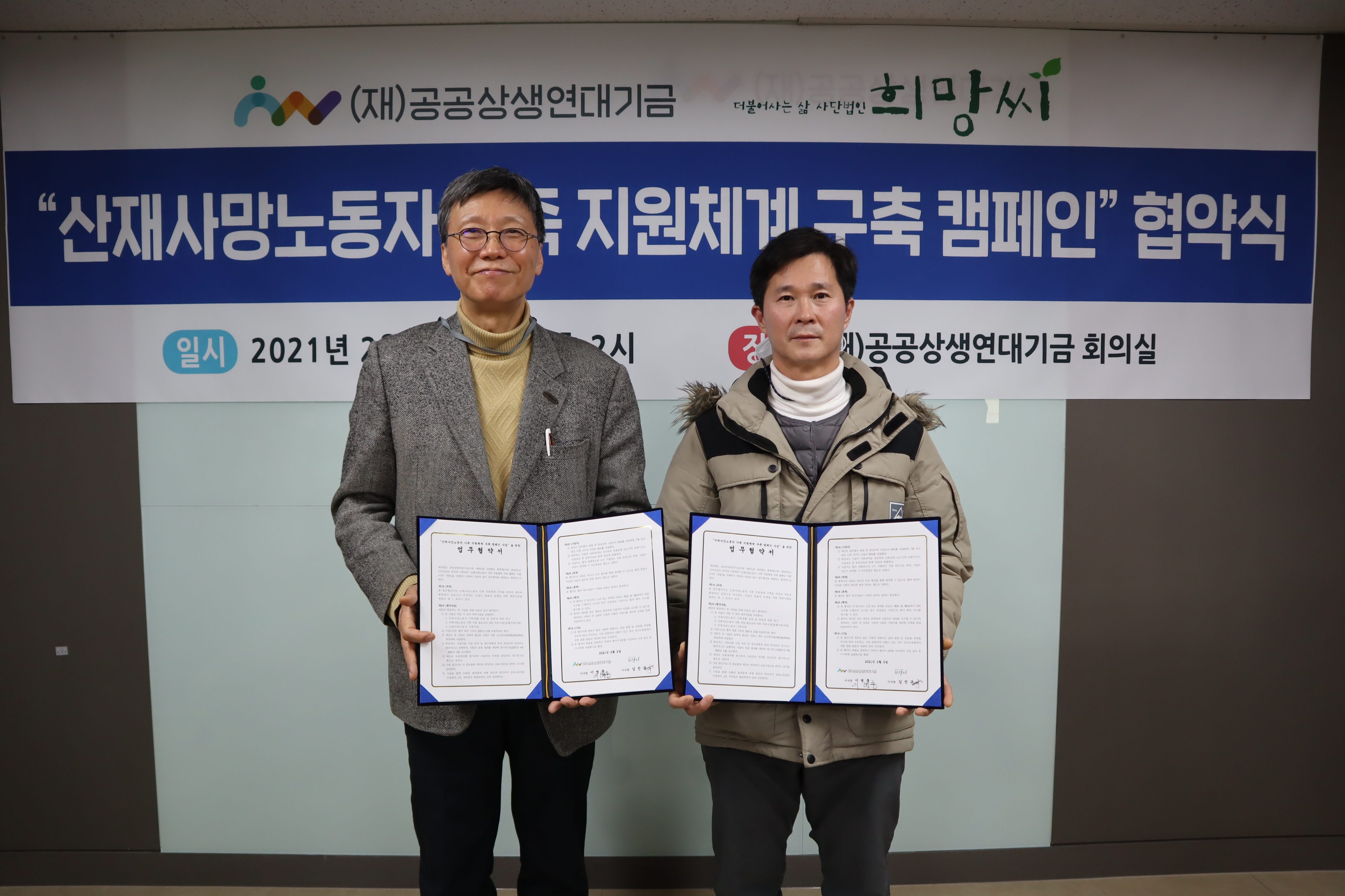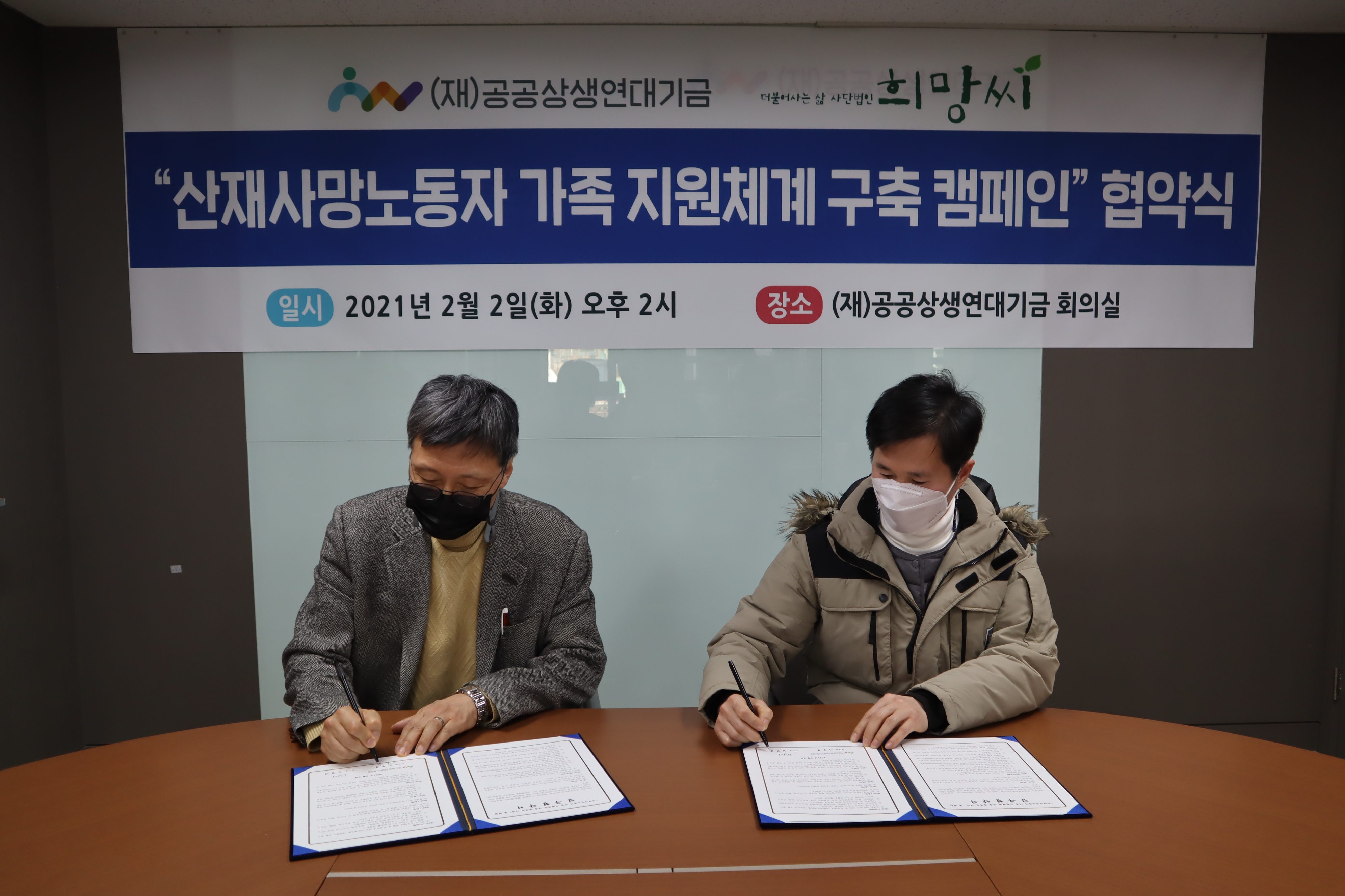 ■ 재단법인 공공상생연대기금(이사장 이병훈)은 2일 재단 회의실에서 사단법인 희망씨(이사장 김진규)와 산재사망노동자 가족 지원체계 구축 캠페인 협약식을 진행했다고 밝혔다.