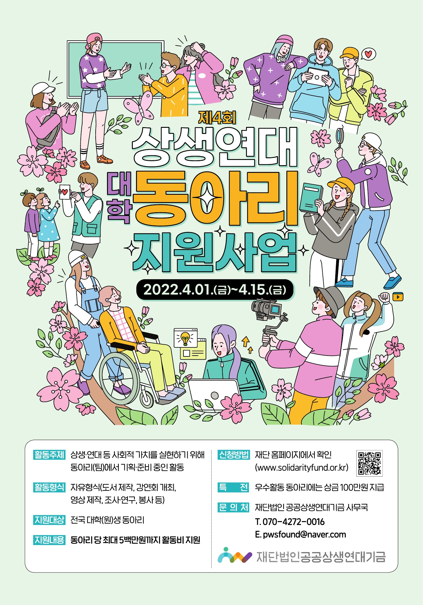 ■ 재단법인 공공상생연대기금(이사장 이병훈)이 대학생 동아리의 공익적 활동을 지원하는 ‘제4회 상생연대 대학 동아리 지원사업’을 실시한다.