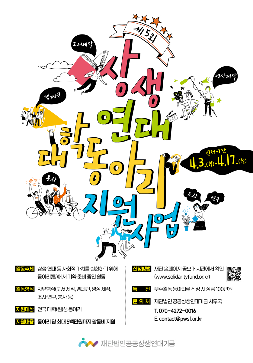 ■ 재단법인 공공상생연대기금(이사장 이병훈)이 대학생 동아리의 공익적 활동을 지원하는 ‘제5회 상생연대 대학 동아리 지원사업’을 실시한다.