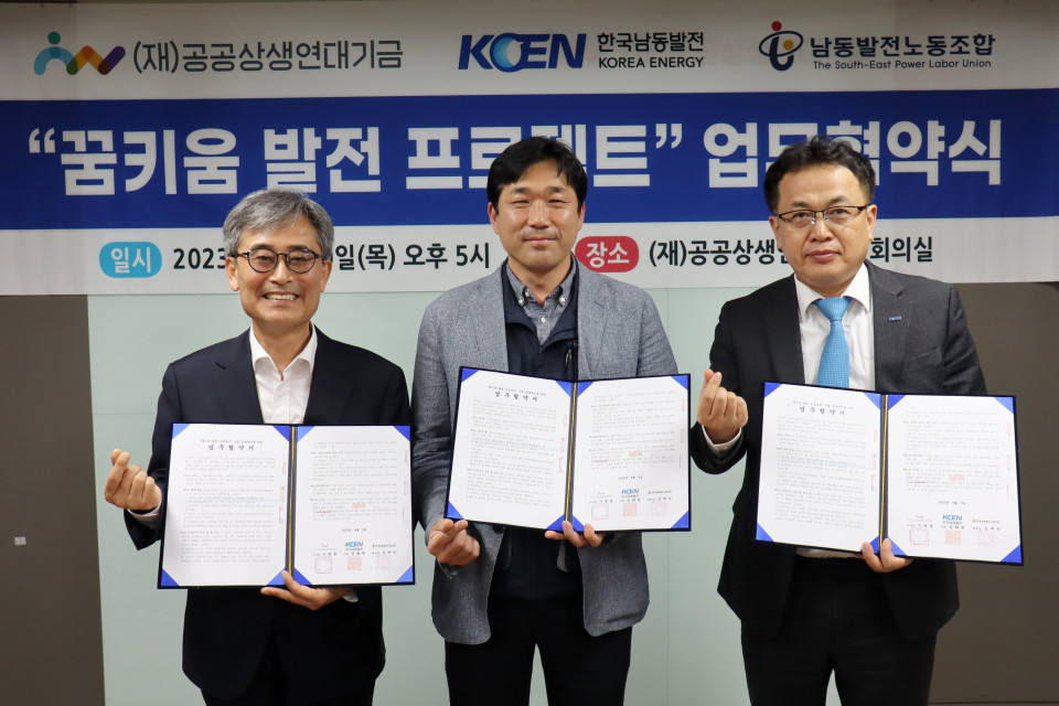 ■ 공공상생연대기금은 20일 재단 회의실에서 업무협약식을 열고 한국남동발전, 한국남동발전노동조합과 협력하여 ‘꿈키움 발전 프로젝트’를 공동 추진한다고 밝혔다.