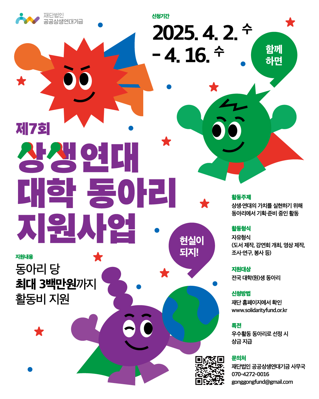 ■ 이번 동아리 지원사업의 지원기간은 2025년 4월 2일부터 4월 16일까지이며, 재단 홈페이지(www.solidarityfund.or.kr)에서 상세한 사업내용과 신청방법을 확인할 수 있다.