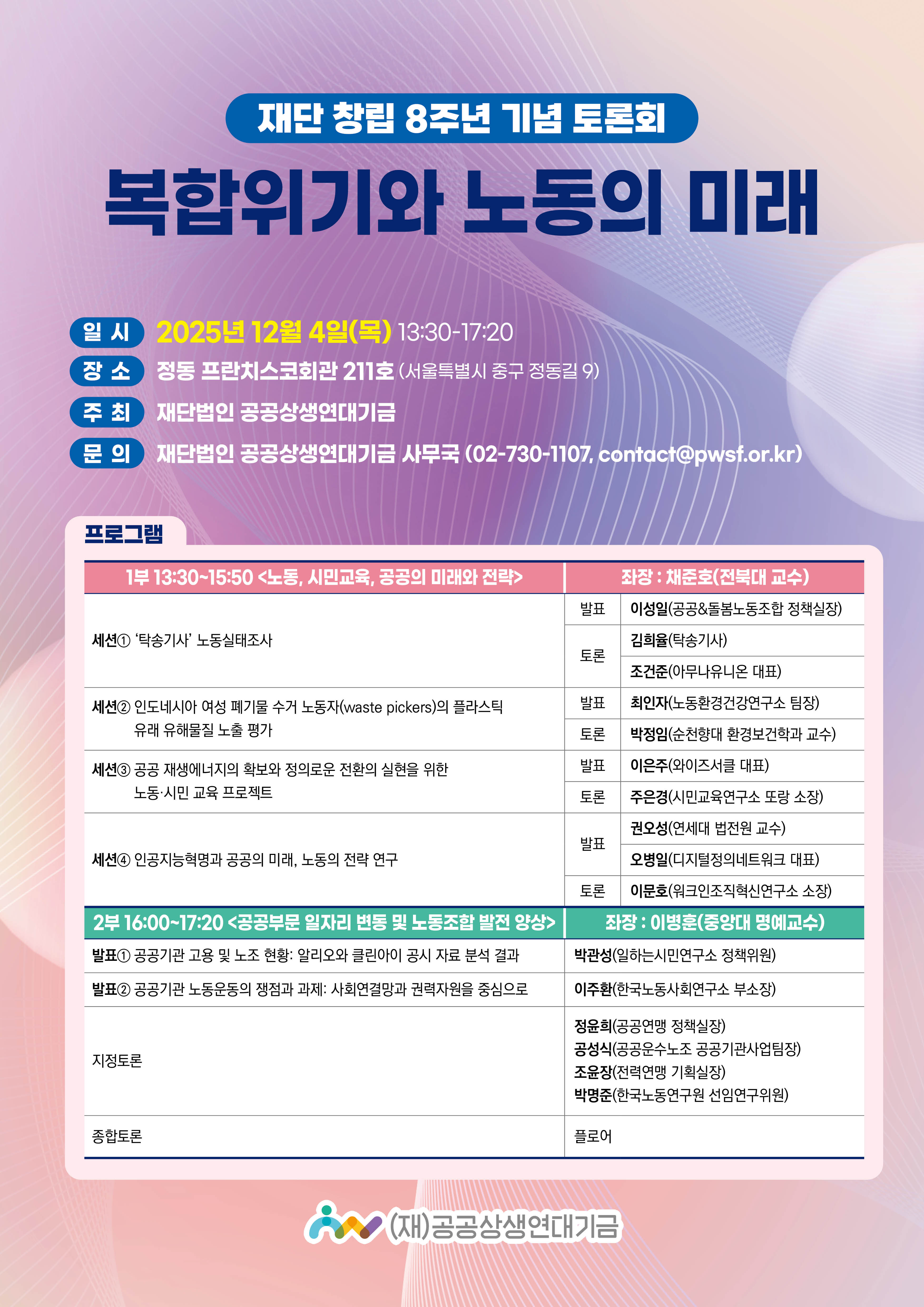 □ 재단법인 공공상생연대기금(이사장 노광표)이 12월 4일(금) 오후 1시 30분부터 서울 중구 정동에 위치한 행사장에서 창립 8주년을 맞아 “복합위기와 노동의 미래” 토론회를 개최한다.