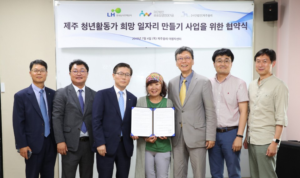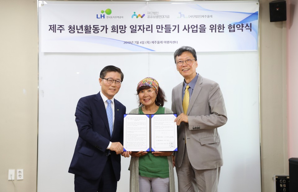 ■ 재단법인 공공상생연대기금(이사장 이병훈)이 4일 LH, (사)제주올레와 함께 ‘제주 청년활동가를 위한 희망일자리 만들기 사업’(이하 ‘희망일자리’) 협약식을 서귀포시에 위치한 제주올레 여행자센터에서